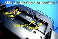 The G25's pedal travel was not as long as my modified Performance Pedals, and the effort was not as great as the springs I used for my compression spring modification. The throttle return spring is particularly light. I like very high spring force and long pedal travel in simulation, because the tactile feedback the user senses through their feet can substitute for acceleration forces felt in a real vehicle. I persevered, hoping for the best from my new investment, but expecting the possibility of using my old modified pedals with the new wheel. The relative positions of the pedals are good, encouraging heel-and-toe downshifting (I was trained to brake with the ball of the foot and blip the throttle with the heel). Like almost all pedal controllers, these pedals are bottom-hinged, unlike most real-world vehicle pedal clusters. This creates a somewhat alien pedal experience to most drivers, and takes a bit of getting used to. I tend to left-foot brake, particularly in formula cars and rally cars, so I'd prefer a slightly wider brake pedal, but that's a minor point.