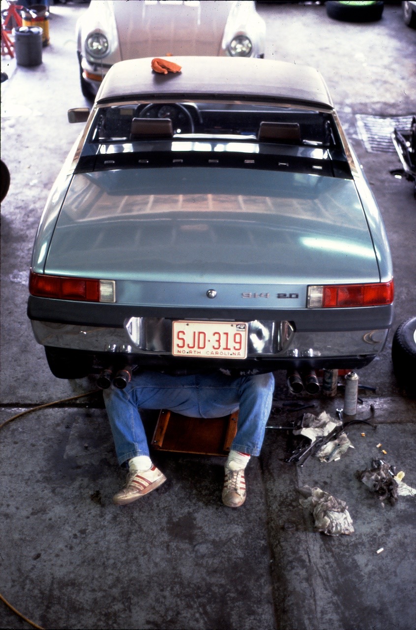 I don’t remember how it was that I starting hanging out at Bill’s shop, but I must have been there most days of the week. I was a night owl, as were a couple of my friends. When I’d get off work at my family’s restaurant at 11pm or later, I’d swing by Bill’s shop to see if the lights were on. Within a short time of going out on his own, Bill’s clientele had produced an 18-month backlog of work. The alleys around Art Thomas’ Texaco on West Friendly Avenue and Smyres Place where Bill rented two or three of the service bays in the back were stacked two-wide in Porsche 911s. Customers would leave their Porsches in his care until he could get to him - he must have gutted his former employer’s service department customer roster. So I’d usually find Bill kneeling on the floor behind a 911’s open engine cover, “praying to the gods of Weissach,” or standing over the open Safety-Kleen solvent sink, his cigarette ashes falling down into the flammable solvent as he scrubbed parts of grease and grime, the cigarette’s smoke causing him to wince as it swirled past his eye.