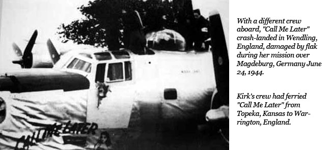 Joe Markus was lost on his first mission. In June of 1944, we were sent to the 93rd Bomb Group for lead crew training; also radar bombing training. We refused this and, at this point, Lt. Smith was taken from us and made a lead crew navigator. Sgt. O. T. Sivley was grounded on about the 7th or 8th mission because of ear problems. After flying 10 missions, all crew members were promoted up one rank: officers to 1st Lt., Kirk and Pop to T/Sgt., and the rest to S/Sgt. Sgt. Sivley was replaced by Sgt. C. A. Johnson. Sgt. Frosty McLaughlin replaced Sgt. Joe Markus. Lt. Sardonia was made bombigator to replace Lt. Smith. Lt. A. J. Jaborski replaced Lt. Smith for a while until Lt. Sardonia took over. Only 7 of the original crew completed the 31 missions together. The ones marked with an X are the ones who did finish.