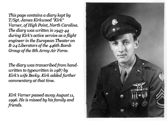 This record comes from the personal diary of T/Sgt. J. Kirk Varner and official records of the 446th Bomb Group. Some of the notes and comments are made in retrospect: